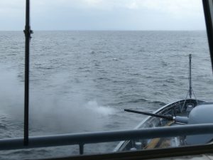 Danach ging der Kurs in der Kieler Bucht Richtung Putlos und das Codewort „Goldhammer“ bereitete das zweimalige Schießen aus der Rohrwaffe OTO Melara 76mm auf 1.000 Yards (= 914, 4 m) vor.