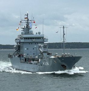 Zeitweise begleitet von dem Tender A 516 DONAU und dem Uboot der Klasse 212 A – U 35 gab es beim Passieren des Marine-Ehrenmales Laboe, der Gedenkstätte für die auf den Meeren gebliebenen Seeleute aller Nationen und dem Mahnmal für eine friedliche Seefahrt auf freien Meeren, die „Ehrerweisung Front“.