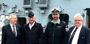 Nach dem Einlaufen im Marinestützpunkt Kiel, die beiden Waffenstationen am Heck der MAGDEBURG waren wieder „scharf“ besetzt, bedankten sich beim „Einlaufbier“, es gab natürlich auch diverse alkoholfreie Getränke, der Beisitzer im Vorstand der REUNION Marine, Fregattenkapitän d.R. Dr. Sven Mues sowie das Ehrenmitglied, Fregattenkapitän d. R. Bernd Koller, bei Vizeadmiral Frank Linski und Fregattenkapitän Max Berger für ihren Dienst als Marinesoldat als auch für die Wertschätzung die sie und die Deutsche Marine der Arbeit und mithin den Mitgliedern der REUNION erneut entgegengebracht haben.
