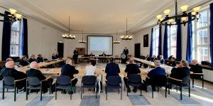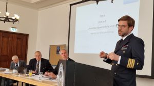 Der darauf folgende Tagesordnungspunkt war der Vortrag von Kapitän zur Lars See Gößing, Leitdozent der Fakultät Marine an der FüAkBw. Der erfahrene Uboot-Offizier referierte mit klaren Worten zur Verteidigungsaufstellung der Marine unter Chatham House Rules.