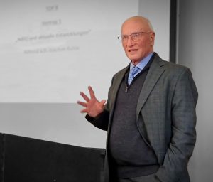 Zum Mittagessen ging man in das nahe gelegene Offiziersheim. Nach dem gemeinsamen Essen mit Admiral a.D. Joachim Rühle, in seiner letzten Verwendung Chef des Stabes des Supreme Headquarters Allied Powers Europe (SHAPE), hielt dieser einen Vortrag über die NATO und die transatlantischen Beziehungen vor dem Hintergrund aktueller politischer Entwicklungen. Im Anschluss an seine Ausführungen beantwortete der Lead Senior Mentor der NATO noch viele Fragen.