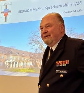 Berührender Tagungspunkt war der von Fregattenkapitän d.R. Bernd Koller gehaltene Nachruf auf den verstorbenen Ehrenvorsitzenden der REUNION Marine, Dipl. Ing. Volker Stein. Unter den jüngst verstorbenen acht weiteren Mitgliedern der REUNION Marine war Vizeadmiral a.D. Helmut Kampe, der erst kürzlich seinen 100. Geburtstag begehen konnte.